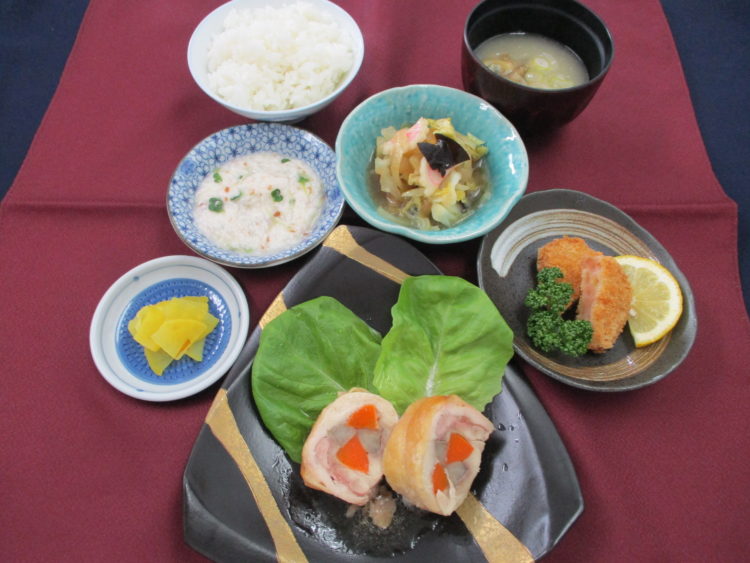 ご飯、あさりとねぎのみそ汁、鶏肉の八幡巻き、キャベツとなるとのソテー、エビカツ、長芋の梅肉和え、かつおたくあん漬