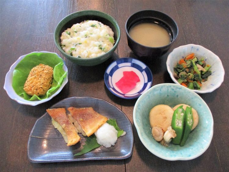 七草粥、けの汁、赤魚の西京焼き、がんもと帆立の煮つけ、かぼちゃのコロッケ、