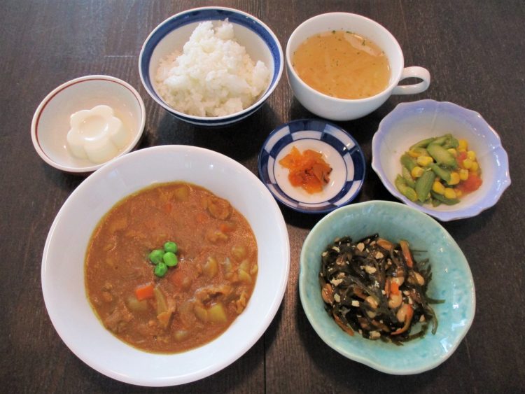 ご飯、大根スープ、ポークカレー、大豆の煮物、アスパラサラダ、福神漬け、ホワイトミニー