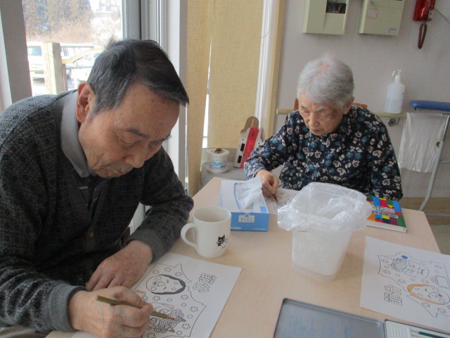 ブログをご覧の皆様こんにちは。1月にしては気温の高い日が続きました。おかげでだいぶ雪が消えました。今日は朝からやや降雪がみられ、寒い日となりました。さて、お正月も終わり、日常生活が戻りました。次の行事といったら2月の節分ですね。そんな気持ちを先取りし、今日は皆様で節分の塗り絵を行ないました。様々な色を使い、皆様楽しみながら行いました。それぞれの性格が見え、なんとも面白いですね。