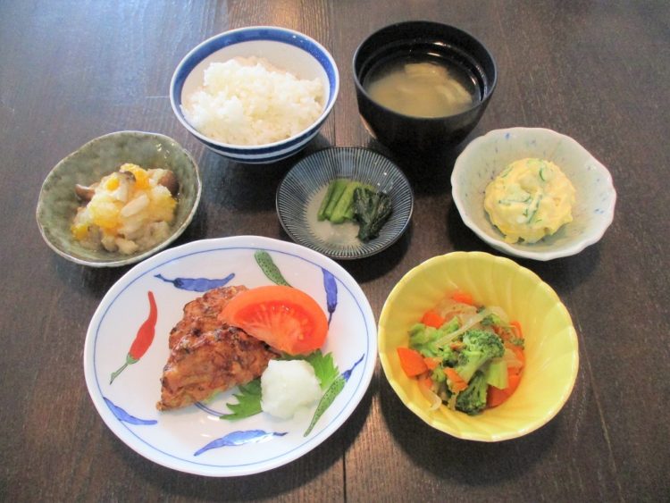 ご飯、オクラのみそ汁、イカメンチ、ブロッコリーのバター炒め、しめじおろし和え、