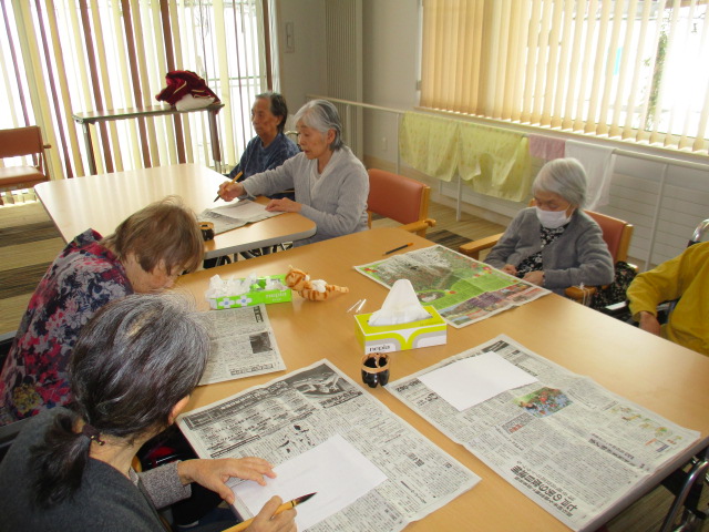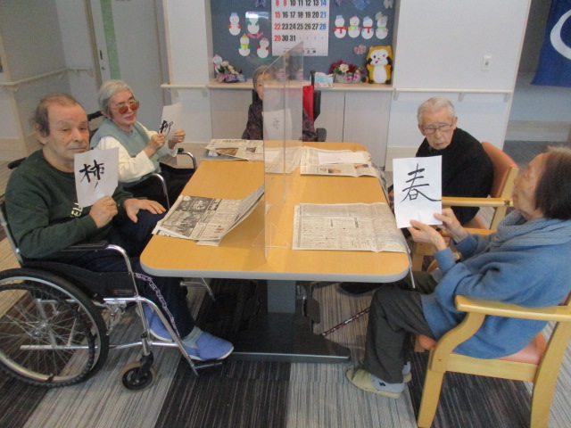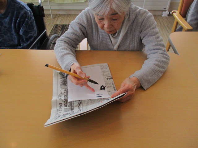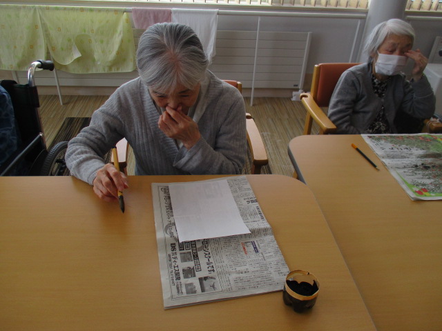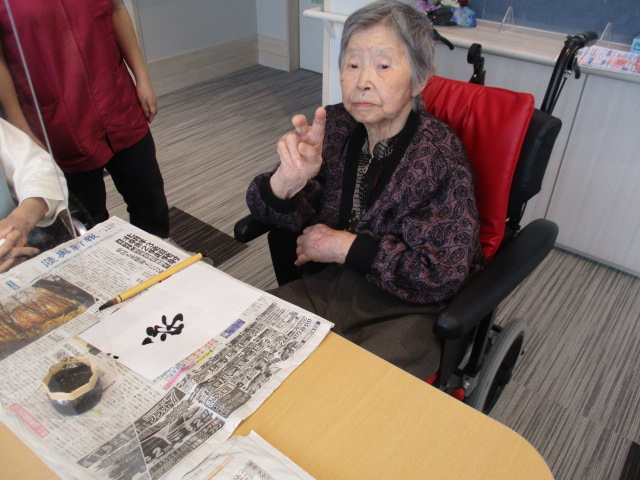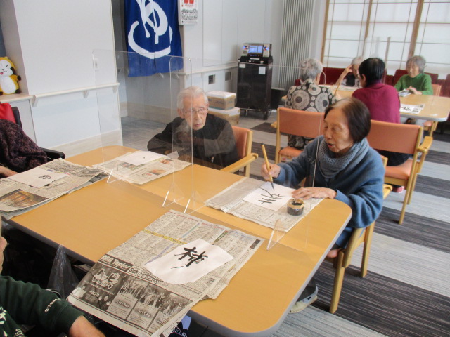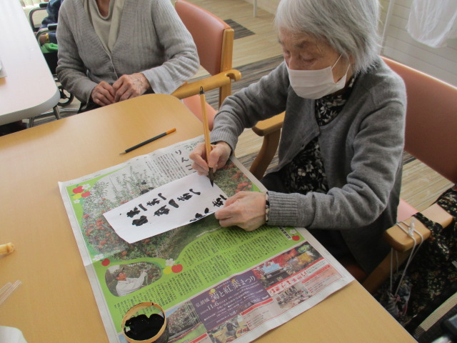 まずはそれぞれご自身が好きな、文字や漢字一文字を書いて頂くようお願いしまいした。何書こうかな~と悩みながらも、思い思いに筆を走らせておられました。さすが、人生の先輩!皆様、とっても字がお上手でびっくりしました。