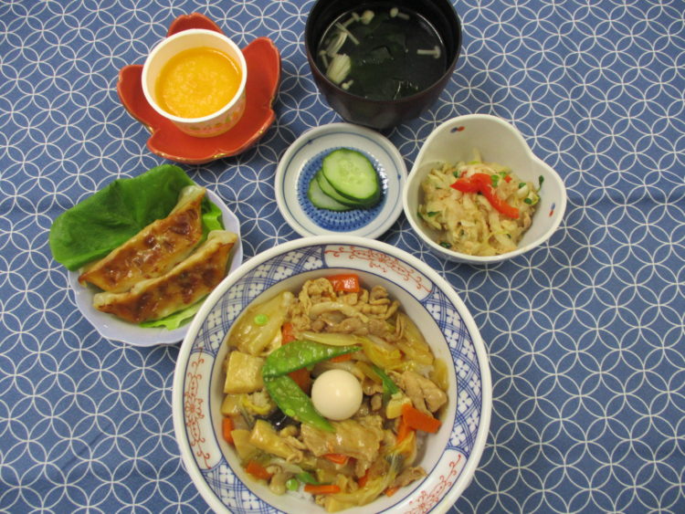 中華丼、わかめスープ、大根とツナのサラダ、焼き餃子、きゅうり漬、みかんゼリー