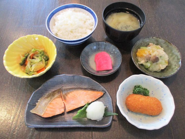 ご飯、白菜のみそ汁、鮭塩焼き、かにクリームコロッケ、ブロッコリーの炒め物、