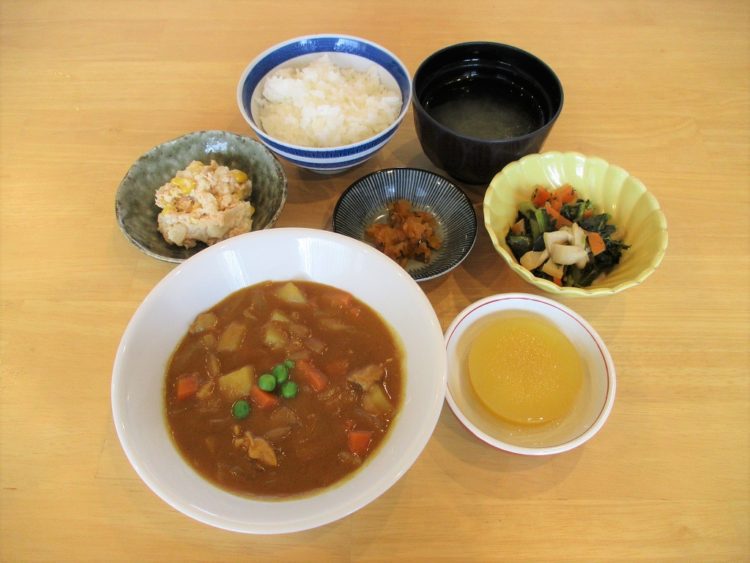ご飯、コンソメスープ、チキンカレー、小松菜の中華炒め、ツナマヨ和え、福神漬け、
