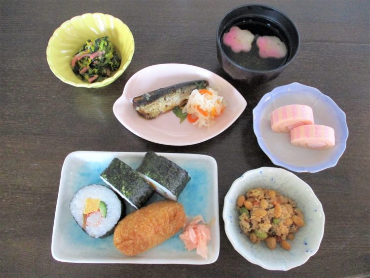 太巻き、いなり寿司、花麩のすまし汁、いわしの梅煮、鶏五目豆、青梗菜のごま和え、がり、