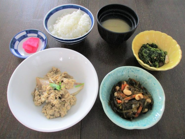 ご飯、えのきのみそ汁、たいとごぼうの柳川風、すき昆布の煮物、春菊のごま和え、赤かぶ漬け