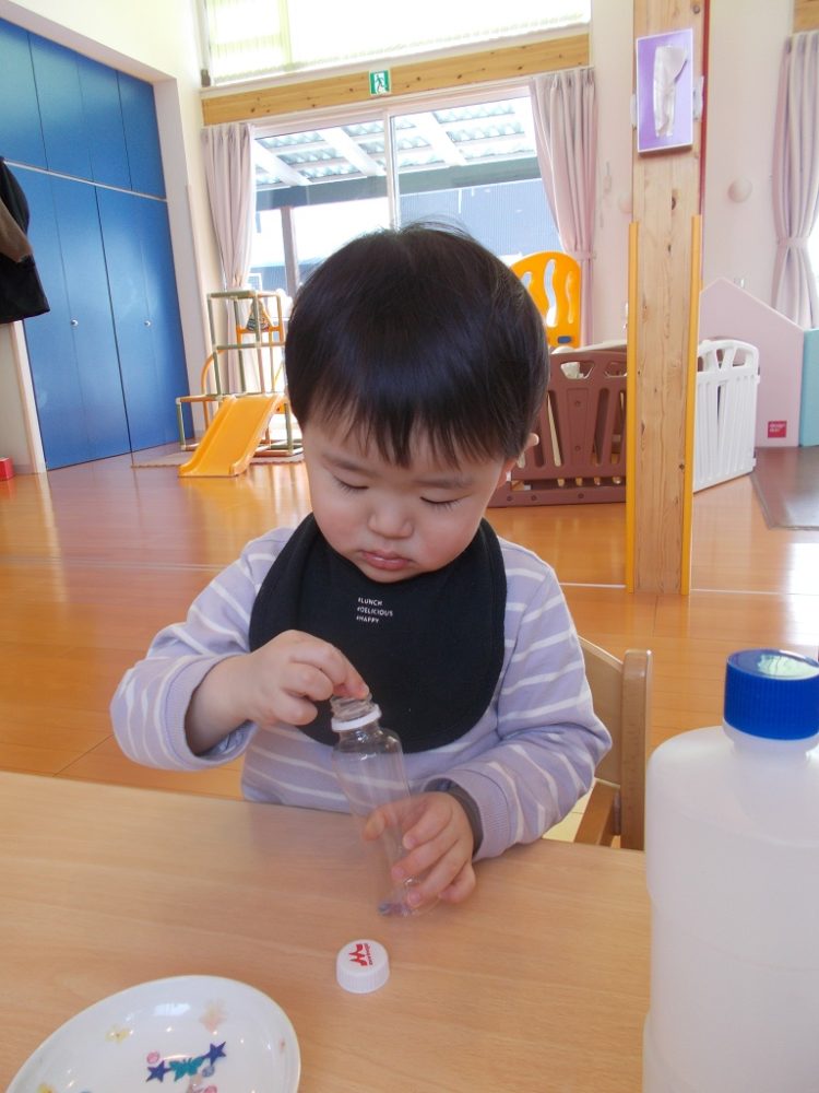 シャカシャカ振って色水を作ります。