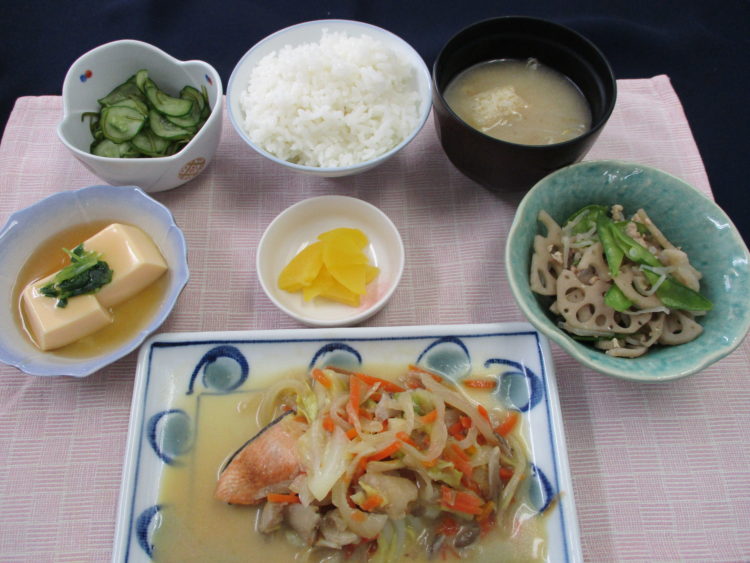 ご飯、もやしと油揚げのみそ汁、鮭のチャンチャン焼き、れんこんのそぼろ炒め、卵豆腐のあんかけ、めかぶときゅうりの和え物、かつおたくあん漬