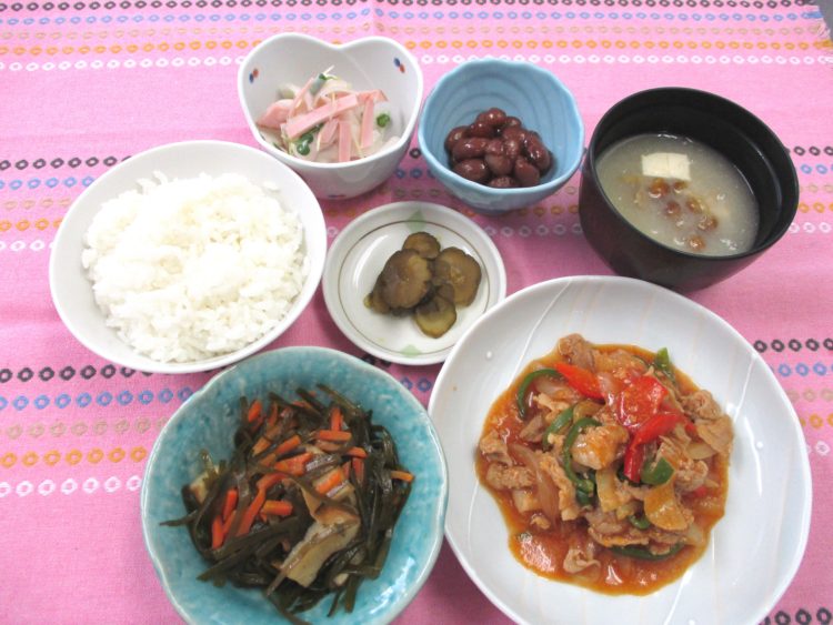 ご飯、豆腐となめこのみそ汁、ポークケチャップソテー、すき昆布の炒め煮、