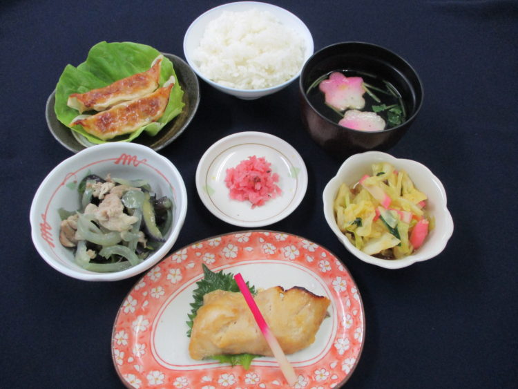 ご飯、花麩と三つ葉の清汁、めばるの西京焼き、なすの中華風ソテー、焼き餃子、キャベツの煮浸し、梅吹雪漬