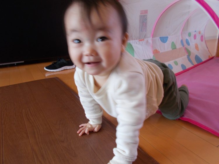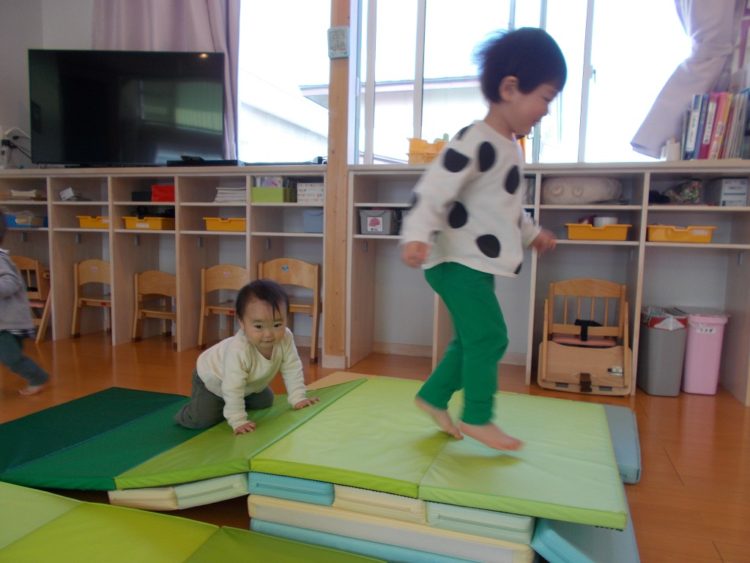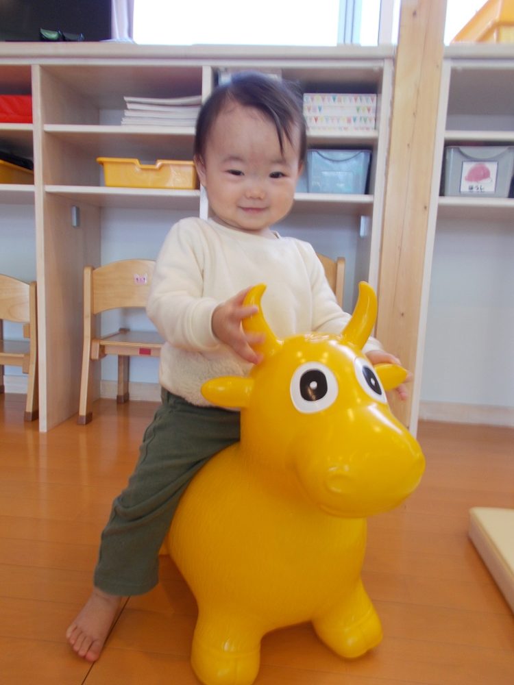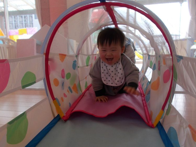 今日もいつものようにくっついて、トンネルをくぐったり、傾斜のある坂道を登ったりして遊びました・・・腕力や脚力がついてきた0歳児さんたちはできることが増えて遊び方がダイナミックになってきました。