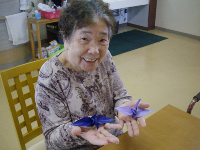 できたのは、鶴でした。K氏、自分で折った鶴を手の平にのせ「頑張ってやってみたよ。かわいいでしょう」とニコニコの笑顔でした。