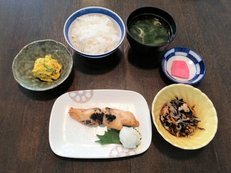 ご飯、ほうれん草のみそ汁、赤魚の南部焼き、ひじきの炒め煮、タマゴパスタ、赤かぶ漬け