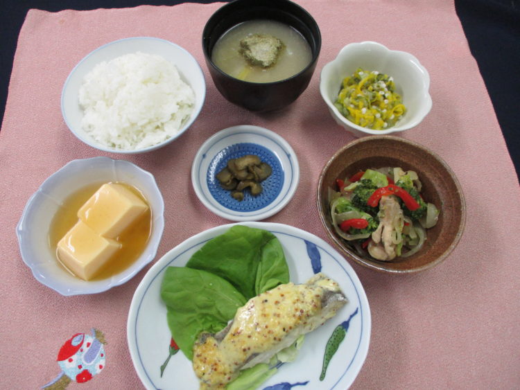 ご飯、白菜ととろろ昆布のみそ汁、かれいのマスタードソテー、ブロッコリーと鶏肉のソテー、味きゅうり漬