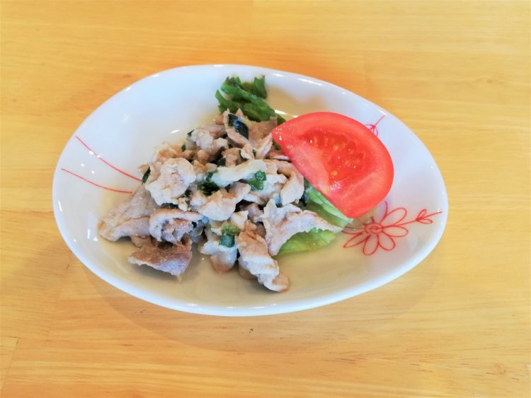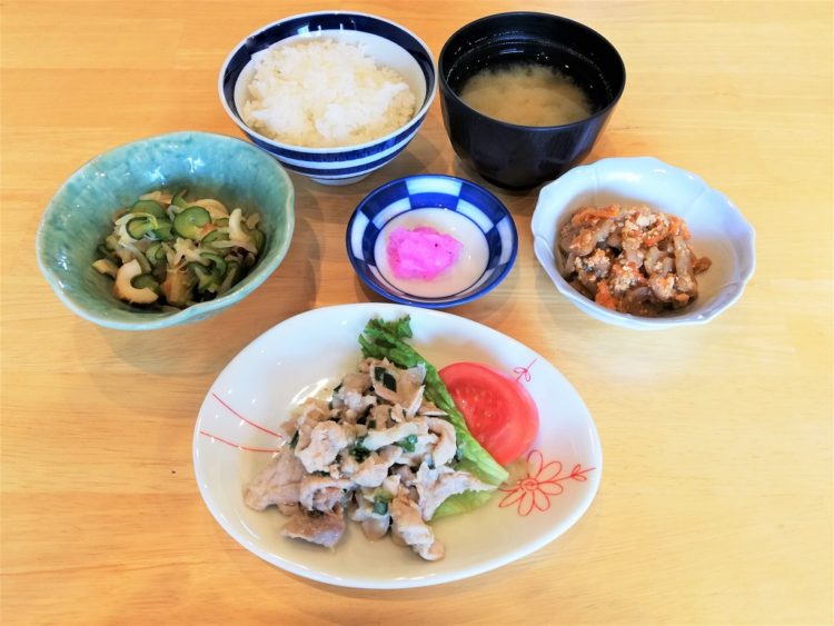 ご飯、キャベツのみそ汁、豚肉の味噌薬味焼き、れんこん金平、ちくわのワサビ和え、桜大根漬け