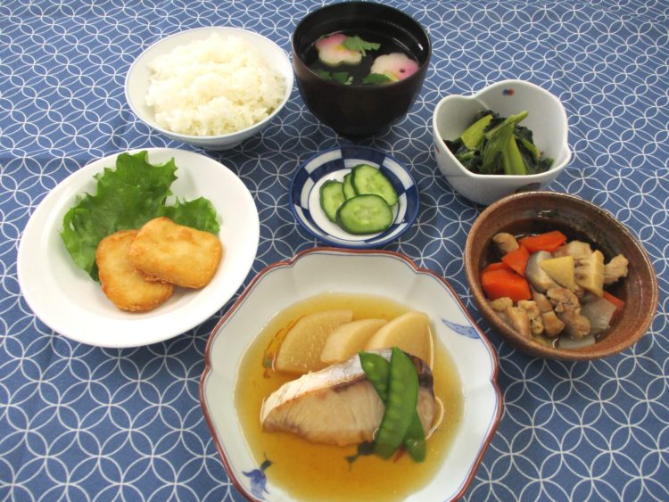 ご飯、花麩と三つ葉の清汁、ぶり大根、筑前煮、豆腐ナゲット、小松菜のおひたし、きゅうり漬