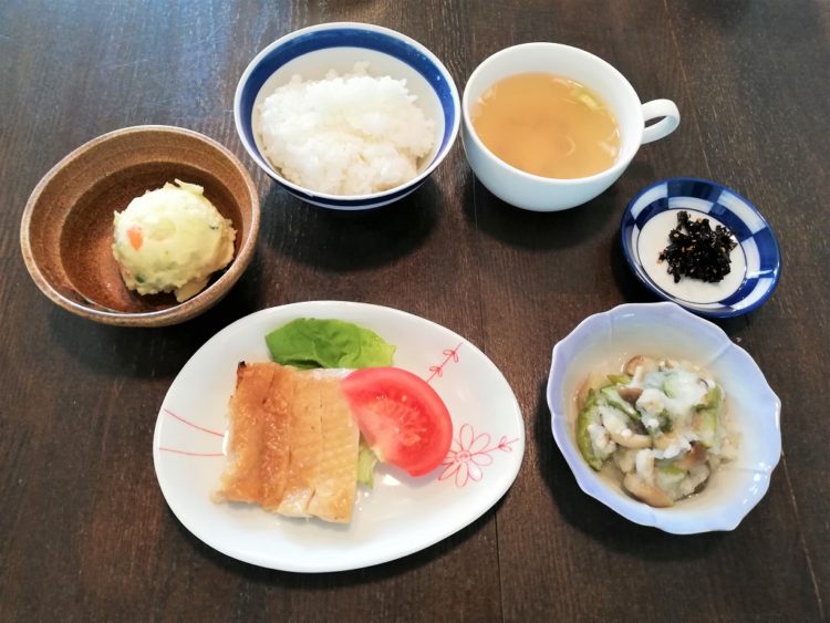 ご飯、あさりのスープ、鶏肉の照り焼き、オクラの甘酢おろし和え、ポテトサラダ、まつば昆布