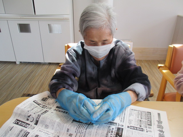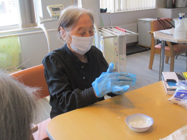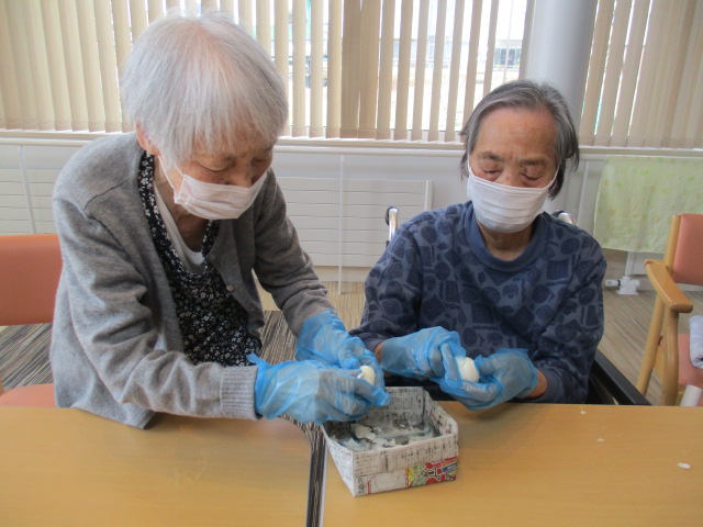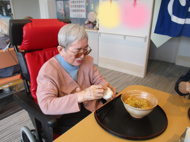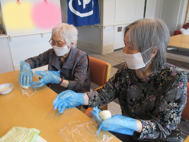 まずは煮卵作りからスタートです。茹でた卵を1階のお客様と一緒に殻を剥き、味付けを行いました。S様は「このまま食べちゃいたい」と何度もおっしゃり、他お客様は大笑いをしていらっしゃいました。続きまして、2階のお客様とミニおにぎり作りを一緒に行いました。皆様握るスピードが速く、あっという間に作り終え「早く食べたいー」「まだー?」等お声が聞かれておりました。