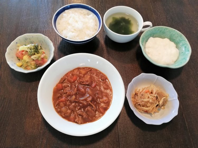 ご飯、わかめスープ、ビーフシチュー、切り干し大根の煮物、ブロッコリーのサラダ、フルーチェ