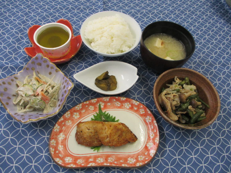 ご飯、焼き豆腐とねぎのみそ汁、めばるの南部焼き、いんげんと豚肉の炒め物、青森県産ごぼうのサラダ、相馬きゅうり漬、りんごゼリー