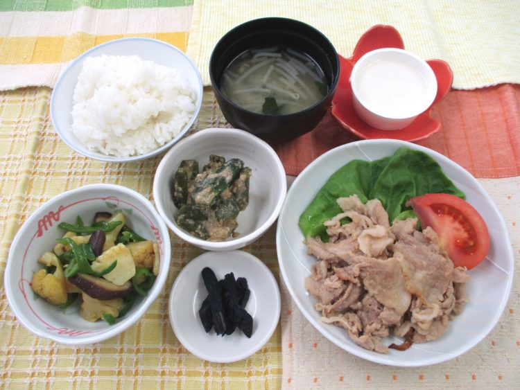 ご飯、もやしとわかめのみそ汁、豚肉の生姜焼き、カリフラワーといかのカレー炒め、