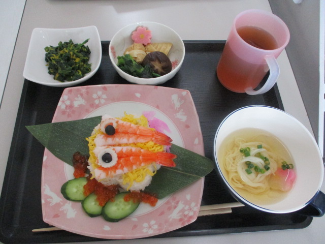 ブログをご覧の皆様こんにちは。今日は朝から雨ふりです。桜も散り、早くも新緑の季節到来です。季節の巡りが早く、戸惑いますね。皆様も体調管理には気をつけてください。さて、昨日の子供の日は、行事食で豪華な昼食となりました。エビやイクラに皆様目を輝かせて召し上がっておりました。季節を感じながらの、楽しいひと時でした。