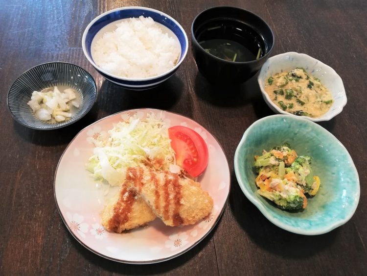 ご飯、椎茸のすまし汁、白身魚フライ、ブロッコリーサラダ、長芋の和え物、白菜漬け