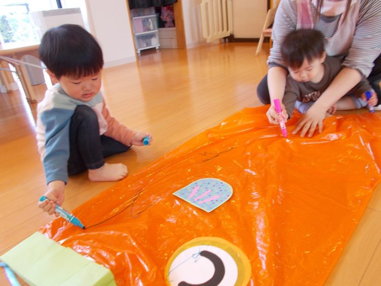 こちらは大きなカラーポリのこいのぼりに絵を描いているところです。