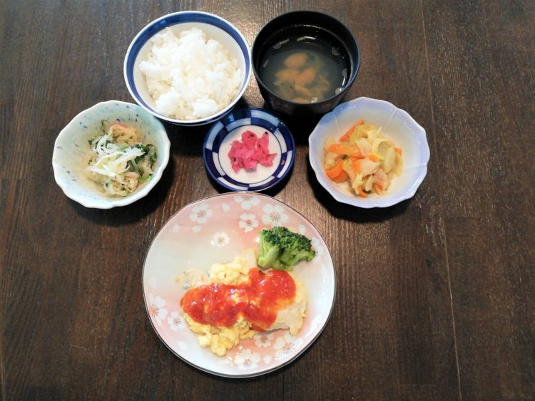 ご飯、あさりのすまし汁、鶏肉のピカタ、白菜の炒め煮、大根サラダ、梅吹雪