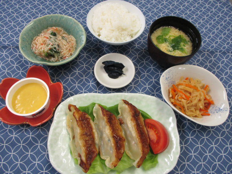 ご飯、かきたま汁、焼き餃子、ブロッコリーのかにあんかけ、切干大根、なす漬、マンゴープリン
