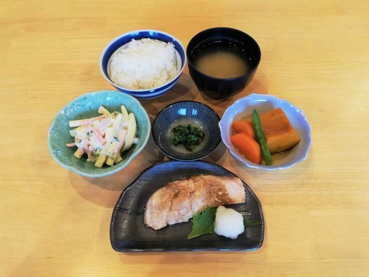 ご飯、もやしのみそ汁、ますの山椒焼き、かぼちゃの煮物、マカロニサラダ、しその実漬け