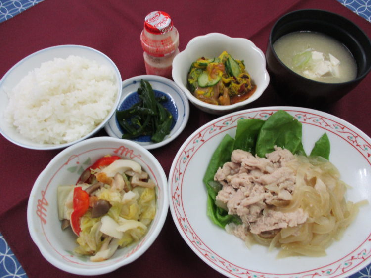 ご飯、豆腐とねぎのみそ汁、ポークソテーオニオンソース、竹輪とキャベツの味噌炒め、きのこ南蛮、わかめ磯漬、ヤクルト