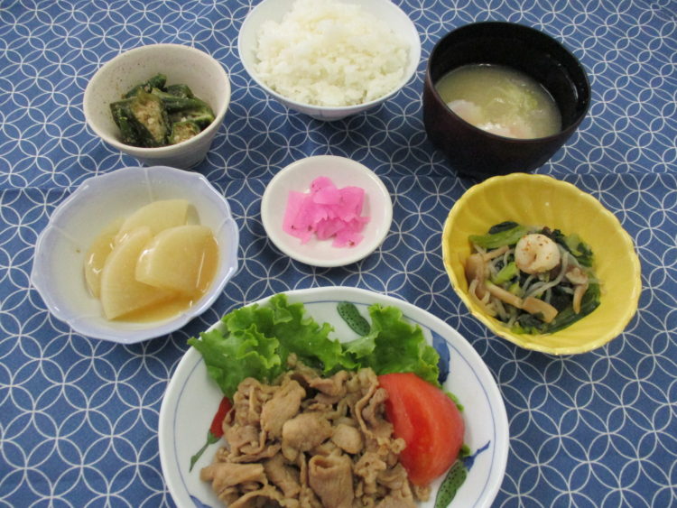 ご飯、なるととねぎのみそ汁、豚肉の山椒焼き、小松菜とえびの炒め物、ふろふき大根味噌たれかけ、オクラごま和え、桜大根漬