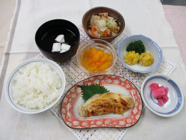 ご飯、はんぺんと万能ねぎの清汁、ホキの味噌マヨネーズ焼き、白菜と春雨の中華風炒め煮、とうもろこしのつまみ揚げ、赤かぶ漬、みかん缶