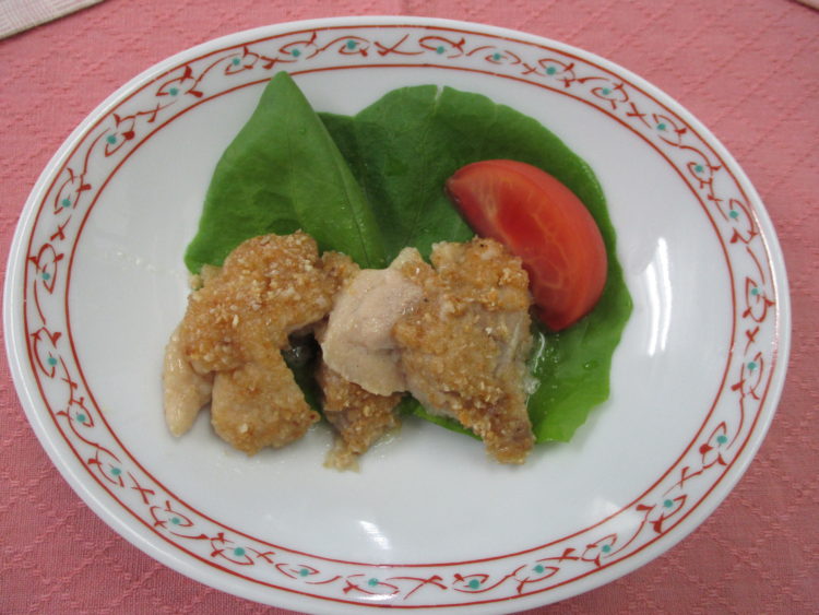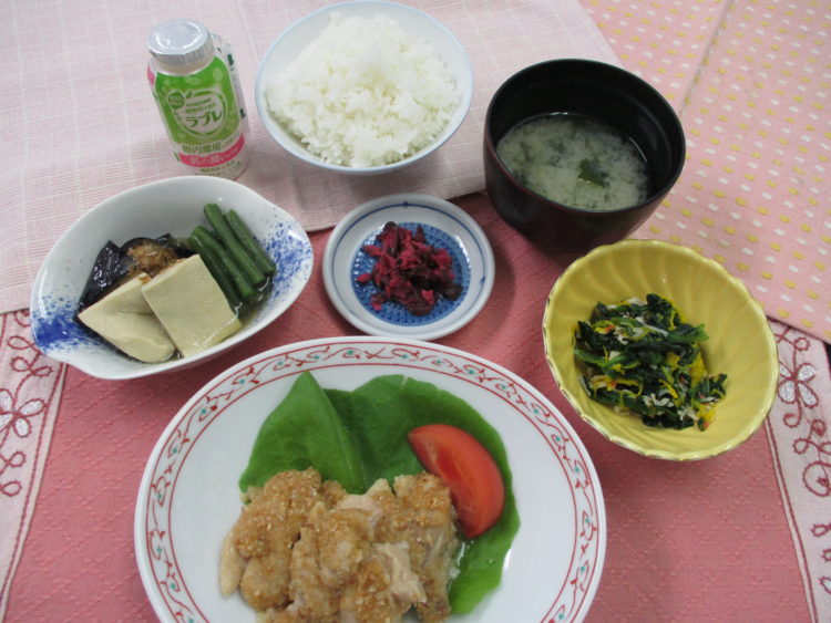 ご飯、細竹とわかめのみそ汁、鶏肉のピーナッツ焼き、なすと高野豆腐の煮つけ、ほうれん草とカニカマの和え物、しば漬、ラブレ