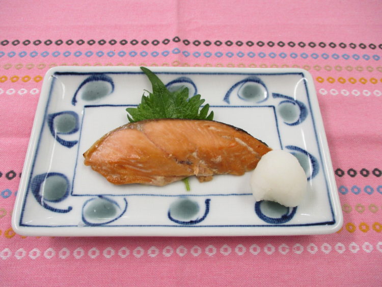 ご飯、棒麩とねぎのみそ汁、鮭の照り焼き、舞茸と生揚げのソテー、コーンシュウマイ、いんげんごま和え、しそ昆布