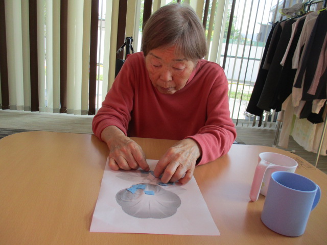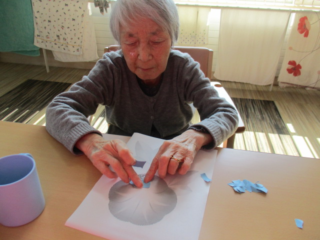 本日は7月に向けてお客様と一緒にちぎり絵を行いました。今回はアサガオです。まずはお客様に貼って頂く色を選んで頂きました。「何色いいべがー」等お話しされた後、「アサガオだはんで青だばいいんでねべが」と青の用紙を選択されました。
