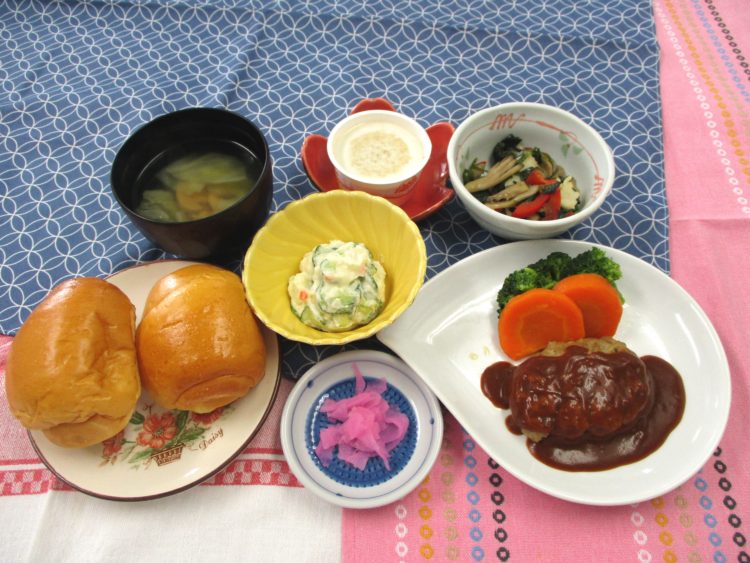 バターロール、キャベツとマッシュルームのスープ、ハンバーグデミグラスソース、