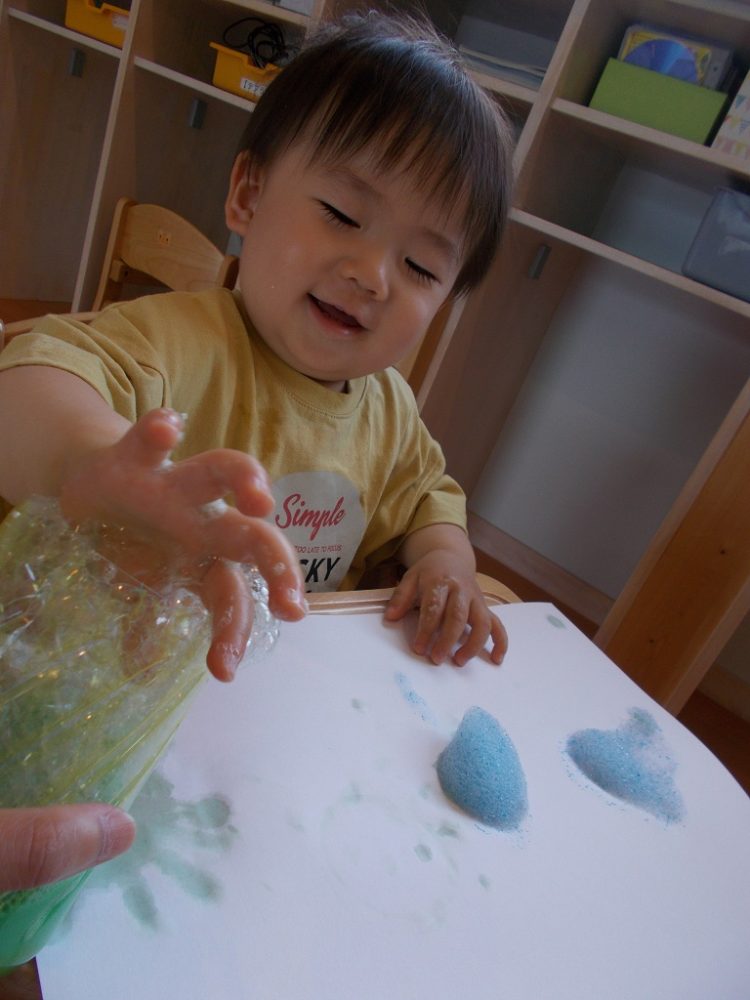 シャボン液と絵の具を混ぜて・・・泡の感触を味わいました!