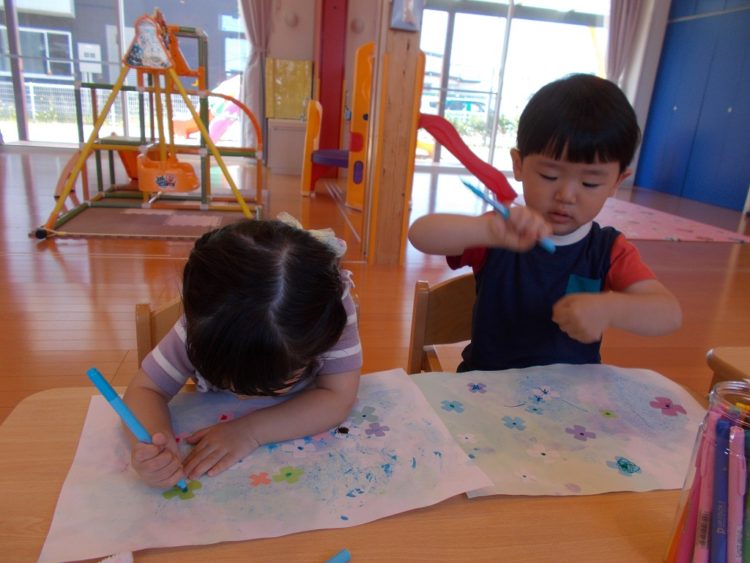 ぞう組のお兄さんお姉さんは、その上にアジサイのお花をペタペタペタ♪