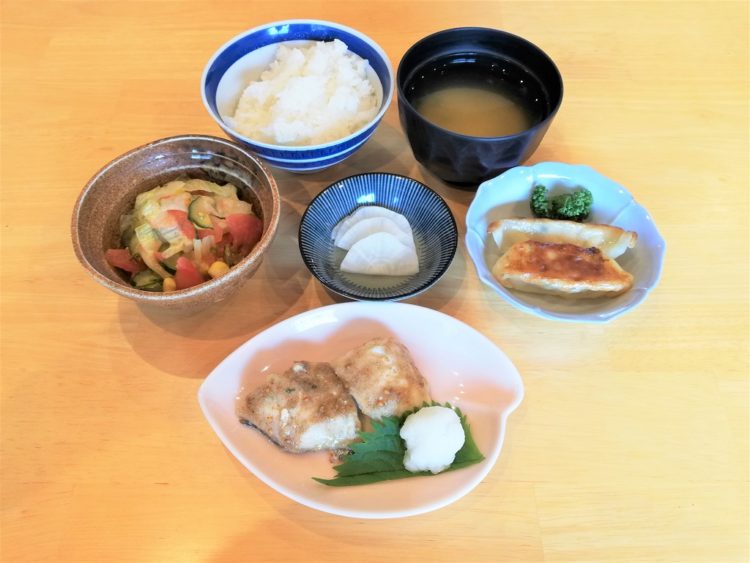 ご飯、大根のみそ汁、メバルの山椒焼き、焼き餃子、トマトのサラダ、べったら漬け