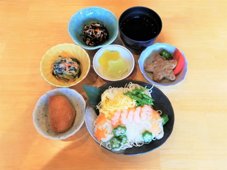 そうめん、いなり寿司、星のハンバーグ、ひじきの煮物、ほうれん草の白和え、七夕デザート