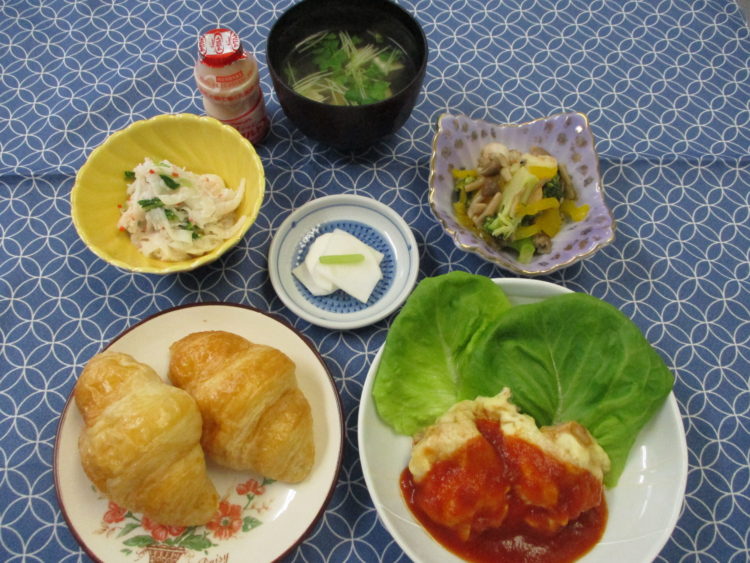 メープルキャラメルクロワッサン、豆腐とかいわれのスープ、鶏肉のチーズピカタ、ブロッコリーとえびのソテー、大根とカニカマのドレッシング和え、白かぶ漬、ヤクルト