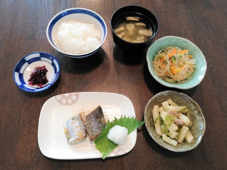 ご飯、大根葉のみそ汁、さわら西京焼き、長芋の和風炒め、春雨サラダ、しば漬け