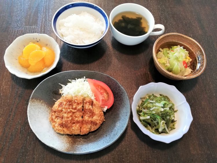 ご飯、わかめスープ、とんかつ、めかぶ和え、レタスのサラダ、みかん缶