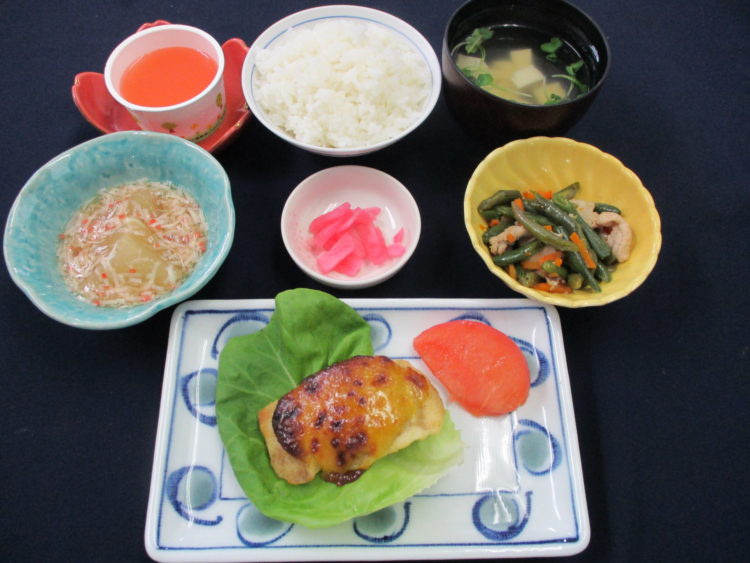 ご飯、豆腐かいわれのスープ、さめの黄金焼き、いんげんと豚肉の炒め物、ふろふき大根かにあんかけ、赤かぶ漬、さくらんぼゼリー
