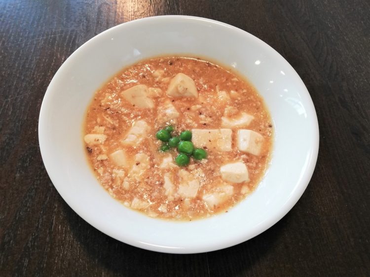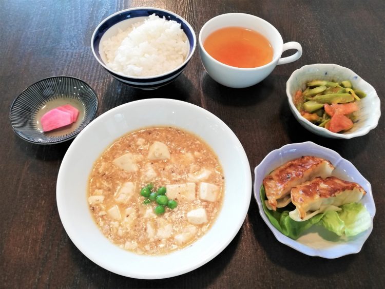 ご飯、中華風スープ、麻婆豆腐、焼き餃子、アスパラサラダ、赤かぶ漬け