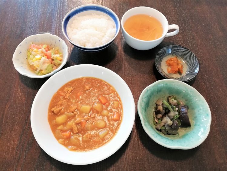 ご飯、オニオンスープ、ポークカレー、なすの炒め物、レタスのサラダ、福神漬け
