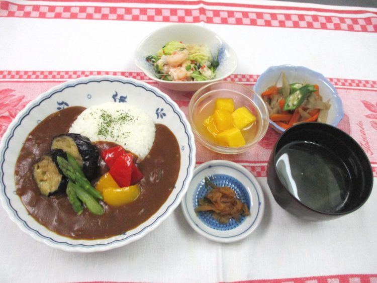 ご飯、わかめともやしのスープ、夏野菜カレー、シーフードサラダ、ごぼうとオクラの柔らか煮、